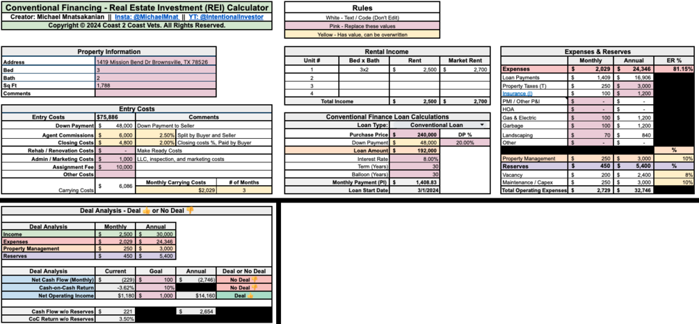 The Intentional Investor is proud to present the ULTIMATE FREE Conventional Finance Real Estate Investing Calculator.