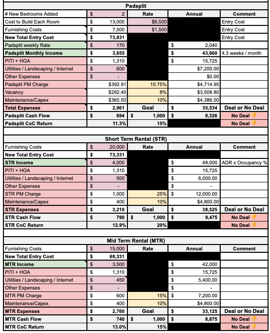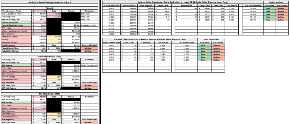 With this one calculator, you'll be able to determine if ANY long-term, short-term, medium-term, or rent-by-the-room (Padsplit) real estate investment is a Deal 👍 or No Deal 👎.