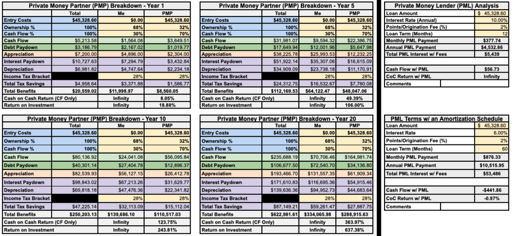 ADDED BONUSES include auto-populating the price and interest rate you would need to have this be a great investment, how the deal looks if you utilize a private money lender or partner to cover your entry costs, as well as evaluating your investment purchase over a long-term hold (up to 20 years). Ever wonder what purchase price or interest rate it would take for a real estate investment to be a good deal? Well now you can instantly!