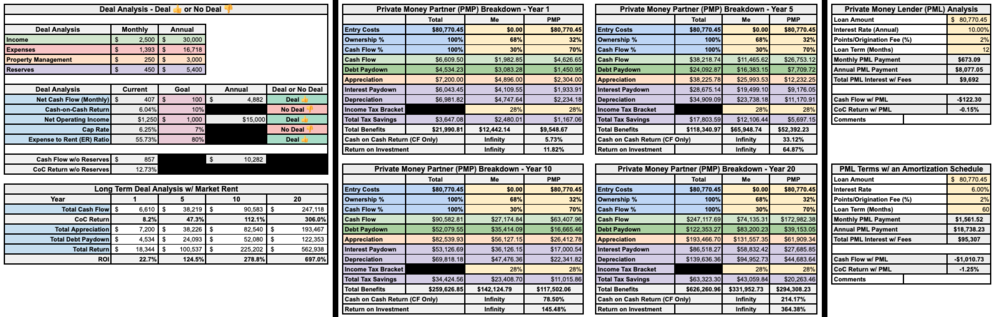 ADDED BONUSES include auto-populating the purchase price and down payment you would need to have this be a great investment, how the deal looks if you utilize a private money lender or partner to cover your entry costs, as well as evaluating your investment purchase over a long-term hold (up to 20 years).